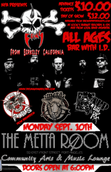 Bay Area legends bring over 30 years worth of punk rock power to Port Angeles , Wa. at the Metta Room for ONE NIGHT ONLY . Monday , September 10th. Local support by The Fibs MCFD and A Lotta Puke. This is an all ages event. Bar available with I.D.