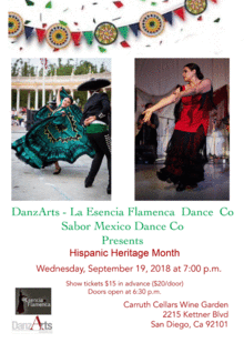 DanzArtsSD - La Esencia Flamenca Dance Co. presents - Flamenco Under the Stars under artistic direction Patricia Astorga-Casey. Join us again for another magical evening at a beautiful outdoor Venue, Carruth Wine Cellars. Guitarists- Kevin Romero & Agustin "El Moro"; Singer - Juan De Dios,and Esencia Flamenca Dancers. We will also have DanzArts- Sabor Mexico Dance Co. join this event dancing regional dances of Mexico