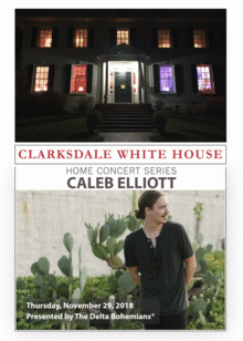 The Delta Bohemians present Caleb Elliott in a Home Concert Series, Thursday, November 29th at the Clarksdale White House, 325 W. 2nd Street, Clarksdale, MS at 7:15PM.