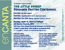 New York-based ensemble enCANTA Collective presents The Little Sweep: Benjamin Britten Centennial at 5:00 pm on Sunday, April 14, at All Saints Church, 230 East 60th Street, NYC. Open to children and adults of all ages, the concert celebrates the centennial year of Benjamin Britten, featuring worksOn this Island, op.11; Canticle III: Still Falls the Rain, op. 55; and one-act chamber opera The Little Sweep, op.45. Performers include sopranos Katherine Copland, Jessica Doolan, Lauren Frankovich, Jessi Goebel, Brittany Palmer, Rachel Policar, Nina Riley; mezzo-soprano Kiri Parker; tenors Christopher Sierra, Eric Richard Werner; baritones Greg Hoyt, Gerald Yarbray; hornist Valerie Sly; pianist Nobuko Amemiya; choreographer/actor Danielle Harper; and stage director Katherine Carter.