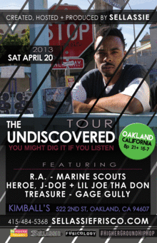 The Undiscovered Tour announces 9 California dates this April 2013. Created and produced by Sellassie and Inhouse Talent, The Undiscovered is a Nation-Wide Showcase Tour designed to market, promote and expose a facet in Hip Hop that is often taken for granted, The Upcoming, Independent Emcee. Contrary to the notions that "Hip Hop is dead" and totally fallen victim to swag, violence, money and negativity, The Undiscovered will prove otherwise. The Undiscovered Tour is focused on positive and lyrical Hip Hop.