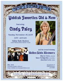 Everyone receives all the song lyrics in Yiddish transliteration and English translation to sing along with CINDY PALEY and the amazing GOLDEN STATE KLEZMERS. ---------------------------------------------------------------------------------------------
