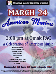 Okanogan Valley Orchestra & Chorus present their final concert of the season on Sunday, March 24th, at the Omak Performing Arts Center. Choral director Jonathan McBride has chosen selections from American artists Cole Porter, Irving Berlin, Samuel Barber, John Denver, plus a medley from the Broadway musical Jersey Boys. American composers featured by the orchestra include pieces by Aaron Copeland and the thrilling Suite from West Side Story by Leonard Bernstein. OVOC has focused on outreach for this season, culminating in the inclusion of over 100 countywide students in this concert. Grant proceeds received from the Woods Family Music and Arts Fund are providing for transportation of students from Oroville, Tonasket, Omak, Okanogan, Bridgeport and Brewster. The grant also covers the price of admission for these students. Each group is working with their schools music educator to learn the choral arrangement for Aaron Copelands Simple Gifts. The tune was written by Joseph Brackett (17971882) in 1848 while a member of the Shakers in Maine. The song was largely unknown outside Shaker communities until Aaron Copland used its melody for the score of Martha Graham's ballet Appalachian Spring (Shakers once worshipped on Holy Mount, in the Appalachians), first performed in 1944. Copland used "Simple Gifts" a second time in 1950 in his first set of Old American Songs for voice and piano, which was later orchestrated. This piece will be performed by the OVOC orchestra as the chorus and dozens of students join in vocal harmony. The concerts have been held on Saturday afternoons but due to scheduling conflicts, this concert will be performed on a Sunday afternoon at 3:00 pm. Tickets are available at the door and through Brown Paper Tickets (event 3742073). Adult price is $12, Senior $10, Youth 14 and under are always free. Contact judy@ovocmusic.org with inquiries.