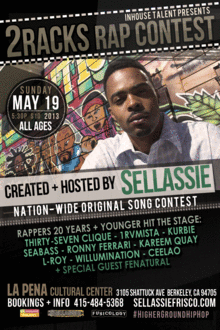 2Racks Rap Contest announces an all ages event on May 19, 2013 in Berkeley, Ca. 2Racks is a Nation-Wide Original Song Contest started in 2010 by Sellassie and Inhouse Talent in San Francisco, CA. 2Racks Rap Contest stops in more than 12 cities from coast to coast including Los Angeles, New York, San Francisco, Berkeley, Chicago, DC, Atlanta, Austin, Houston, Orlando & Seattle. 2Racks looks forward to presenting an event for rappers 20 years old and younger only.