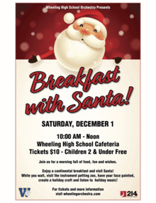 Santa is coming to Wheeling High School. Join us for a musical celebration of the holidays! Enjoy a continental breakfast while you wait to visit the man in the red suit, visit our instrument petting zoo, listen to Holiday stories, sing carols, and most importantly have your photo taken with Santa!