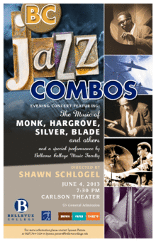 Please join the students of MUSIC 206/106B, Bellevue College Jazz Combo, for an evening of jazz music from Monk, Hargrove, Silver, Blade and others .This Spring quarter has brought several new talented musicians to the BC Jazz Combo. This concert will include two sets of music. Ticket price is $5.