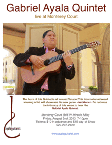 Along a new thread in the tapestry of Gabriel's progression, we welcome him back to the Monterey with his new Quintet. Featuring Gabriel on guitar, Troy Gray on bass, Danny "Simi" Brito and Eric Hines on Percussion, and Amilcar Guevara on keys, they expand on the nuance of Gabriel's earlier trio for a more robust performance of the genre Gabriel calls JazzMenco. Gabriel played at President Obama's Inaugural Ball, for Pope Benedict at the Vatican, and has performed at the Kennedy Center for the Performing Arts, Smithsonian Institute's National Museum for the American Indian, and the ASU Kerr Cultural Center. His performance will include well known standards such as "Take Five," "Spain" and "Caravan." An accomplished guitarist with impeccable technique, Gabriel has melded his love of jazz to his classical and Flamenco training to create an exciting new twist to both genres.