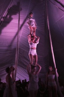 Inspired by the idea of creating community in trying times, Brave Space starts as a puddle of fabric on the floor, and grows to encompass a world of wonders that includes juggling, cyr wheel, and duo trapeze, a rope act like no other, and awe-inspiring feats of balance and strength. The audience is limited to 100 people per show, and audience members must be able to sit on the floor, stand up, walk around for the duration of the performance. Audience members requesting assistance, or a chair to sit in, should note so when purchasing tickets. In addition, Brave Space may make persons suffering from claustrophobia feel uncomfortable at times.