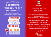 At this ticketed event, Bookmarks will announce the line-up of our 2019 Festival authors! 2019 marks our fifteenth anniversary, so this will be a night to remember. The evening will include music by Cesar Oviedo's Trio, heavy hors doeuvres, Raffaldini wines, and a silent and live auction featuring dozens of local businesses and exclusive experiences in Winston-Salem! The night will feature the opportunity to purchase tickets for the Festival before anyone else.