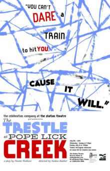 THE TRESTLE AT POPE LICK CREEK by Naomi Wallace High atop a railroad trestle that spans a bone dry creek, two teenagers plan to race across the bridge against an oncoming locomotive. At first their scheme adds excitement to life in a small factory town during the Great Depression, then sensual experience awakens dangerous passions in an era of stifled ambitions. With theatrical flourish and lyrical finesse, award-winning playwright Naomi Wallace delves into a world where people struggle to change lives that bear down upon them. Directed by Saskia Bakker
