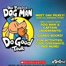 About the Event: Meet Dav Pilkey, hear his inspiring story and learn why it matters to Do Good! This event will feature a presentation and live drawing by Pilkey, ways for you to learn how you can do good, photo ops with special characters from his series and cool giveaways, plus a copy of his newest book, Dog Man: For Whom the Ball Rolls which will include a limited edition Do Good Tour bookplate.