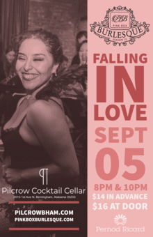 (Birmingham, AL) Pink Box Burlesque is Falling in Love at Pilcrow Cocktail Cellar on September 5th! Catch Alabamas premier burlesque troupe in an intimate setting with decadent cocktails and the sultry tones of Mama Dixie & the Prize Inside, the Pink Box Burlesques live jazz band. Pilcrow Cocktail Cellar opens at 4pm. Shows at 8pm and 10pm.