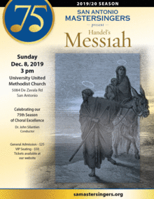 Join the San Antonio Mastersingers with orchestra when we bring this masterpiece to life for you, Sunday, December 8th, 3PM, at University United Methodist Church: 5084 De Zavala Rd.