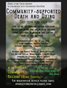 Thank you for your interest in attending our Community-Supported Death and Dying Weekend. In collaboration with Spiral Living Center and Crossroads DeathCare, we will have discussions and workshops centered on death and dying. We will explore ways our community can come together in support and loving care of one another. Learn valuable skills and tools for grieving, ritual and ceremony. Registration is required for attending and a donation of $20-$70, no one turned away for lack of funds. Please donate based on your ability. For out of town folks--There are numerous local, over-night accommodations: Air B&Bs are the best local option. This event is being held at the Takilma Community Building, outside of Cave Junction,9367 Takilma Rd. 97523. **Feel free to bring a photo of, or object representing, any beloved departed ones for the ancestor altar.