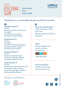 Escena Sur Reading series: Latin America, Spain and Latino/a USA, is a public staged reading series, in a mini-festival format, that will be presented at Theater 54 at Shetler Studios located at 244 West 54th Street, 12th Floor, between 8th Avenue and Broadway in Manhattan. On December 12th, at 7:30 pm., we will be presenting Memorama by Mario Cantú Toscano, translated by Carmen Rivera and directed by Stefania Burbarella. On December 13th, at 7:30 pm., Cuzco by Victor Sánchez Rodriguez, translated by William Gregory and directed by Kristin Heckler. On December 14th, at 7:30 pm., Honduras by Sarah Farrington, performed in Spanish by Valeria Avina and translated by Walter Krochmal, and on December 15th, at 5:00 pm., Dos Amores y un Bicho by Gustavo Ott, translated by Heather L McKay and directed by Pablo Andrade. Tickets online for each reading will be only $8.00 and at the door $12.00