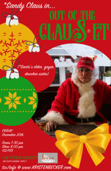 Who ever Said Santa was an only child? This Christmas join The Focus Theater as it hosts Out of the Claus-et, a live interview with Sandy Claus: Santas older, gayer drunker sister. From #metoo to the elf uprising of 2001, Sandy dishes the dirt with up and coming reality tv journalist, America Stevens. Starring Kristen Becker and Darlene Van Alstyne, the lovable drunkard Sandy Claus sets the record straight about the North Pole and removes the shroud of secrecy that has long hidden the truth around Santas empire.