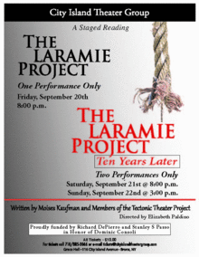 The City Island Theater Group presents a staged reading of The Laramie Project & The Laramie Project : 10 Years Later written by Moises Kaufman and Members of the Tectonic Theater Project. Directed by Elizabeth Paldino.