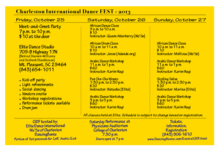 Event #1 Meet-and-Greet KICKOFF party ($10 at the door) Friday, October 25, 2013 Elite Dance International 709-B Johnnie Dodds Blvd Mt. Pleasant, SC 29464 7 to 10 pm Refreshments served Open dancing General admission at the door for $10