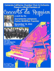 Sacramento Composer/Pianist Carlos McMillan-Fuentes is featured in both his roles with the acclaimed Camerata California Chamber Choir and Orchestra and Maestro Pete Nowlen. Vocal Soloists include Ava Delara, Kathleen Moss and Matt Hidalgo.