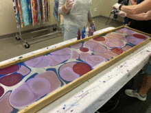 Each artist applies acrylic paint to the special water bath, floating the colors in a custom-built water marbling tray, then uses marbling combs, rakes, or stylus to create the design of their liking. Each student will go home with a six foot, 100% Silk Scarf. They are great as a table runner, scarf, window hanging, beach wrap and any other use you desire.