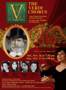 We perform in the acoustically magnificent First United Methodist Church, 1008 11th Street, Santa Monica. Free parking is available directly across the street. We look forward to seeing you there to help us honor this important milestone in the history of opera and the Verdi Chorus. Viva Verdi!