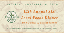 SLC's 12th Annual Local Foods Dinner is going TO-GO style this year! Join us for our biggest fundraiser of the year, Saturday November 14th, 2020 for a one-of-a-kind event featuring local food, a virtual auction, and entertainment. We are creating multi-course meals boxed for pick-up to be enjoyed at home. All food is made in cooks and/or commercial kitchens and features ingredients from within a 100 mile radius.