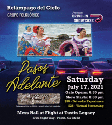 This fun family drive-in event is a screening of on location performances filmed throughout Santa Ana and Orange County featuring lively dances representing the rich culture of Mexico. Pasos Adelante, or, Steps Forward, showcases the resilience of our performers, from our tiny tot students to our company dancers, in continuing to bring the beauty of this cultural dance to its audiences.