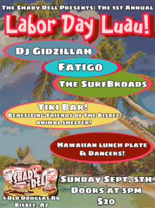 The Shady Dell presents our first annual Labor Day Luau! Hosted by Gidzillah & Sonia Rita, featuring music by The Surfside IV, Fatigo, Gidzilla! Hawaiian food, dance and drinks! Tiki Bar will be benefiting The Friends of The Bisbee Animal Shelter!