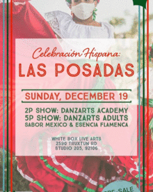 Come join us for traditional celebration of "Las Posadas" through music and dance. DanzArts - Children's Academy, Sabor Mexico Dance Co. & La Esencia Flamenca Dance Co. will be performing. Tickets seats are first come first serve & snack/beverages will be available for purchase.