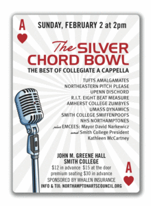 This legendary event is a tradition. People jam the 2000 seat hall.This year we will showcase some of the best collegiate groups in the country including local sensations the Smiffenpoofs from Smith College who are fresh off a visit with the President and first lady. Other local favorites the Northamptones from Northampton High School and the Amherst College Zumbyes with their acrobatic choreography, as well as the Umass Dynamics who always bring their A game will be on hand at this great event! Joining the SCB lineup from Rochester Institute of Technology, we welcome Eight Beat Measure. Last year they placed third in the Mid Atlantic Semifinal round in the ICCA also capturing the award for best arrangement. This year they sound even stronger! UPenn Dischord brings an intense energy from Pennsylvania, Northeastern University Pitch Please has been tearing it up, and the Tufts Amalgamates are ready to unite the crowd at John M. Greene in shear harmonic bliss! Mayor David Narkewicz and Smith College President Kathleen McCartney will be on hand as emcees for this classic Northampton event.