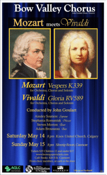Bow Valley Chorus will showcase two great choral works: Mozart's Vespers K339 and Vivaldi's Gloria for its first concert in over two years. These works are musically vibrant, joyful and will fill the listener with a sense of hope for the future as we move forward from these difficult times. The Vespers shows Mozart at his choral best, setting the texts of the church evening service tohis youthful musical pathos. The Gloria (along with his Four Seasons) has become one of Vivaldi's most popular works. These two works perfectly complement each other, for an evening of beautiful music. Come and join us!