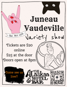Juneau Vaudeville presents our next Variety Show!! With the spooky season just around the corner what a better way to help ward of those evil spirits than a lovely night with some dress up and maybe a little bit of dressing down hosting a variety of different acts from some of our original performers and maybe a few new. Come see us live at the Alaskan Hotel & Bar Doors open at 8pm