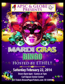 This is NOT your Grandma's Bingo!!! This is non-stop campy fun hosted by the ever effervescent "ETHEL!!", a musical comedy performance troupe made up of members of the Seattle Men's Chorus. The only thing bigger than their talent is their hair! Come join us for the fun and win big cash prizes in a fun and safe environment! This is a non-alcoholic event, but don't let that discourage you. There's plenty of trash-talk and festive live performance to keep you in the party mood. This time the theme is "Mardi Gras" so don your masks and beads and WIN WIN WIN! Organized and run by volunteers, all proceeds from this event benefit GLOBE (GLBTQ Youth Support Group) and APSC (Aids Project Snohomish County.)