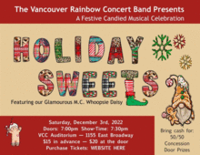 Call your dentist now, this show is loaded with so many sweets you'll need a visit after this concert! Featuring songs such as Clarinet Candy, Visions of Sugarplums, Sweet Georgia Brown, Bittersweet Samba, Suite of English Country Dances, and Themes from the Nutcracker Suite, this concert is sure to please even your sweetest cravings! Date: Saturday, December 3, 2020 Time: 7:30pm, doors open 7:00pm. Location: Vancouver Community College Auditorium, 1155 East Broadway, Room 2010 Cost: $15 in advance, $20 at the door, $5 18 & Under