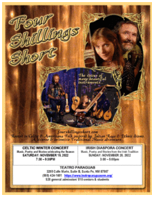 Four Shillings Short, the husband/wife duo of Aodh Og OTuama from Cork, Ireland and Christy Martin from California, perform Traditional and Original music from the Celtic lands, Medieval & Renaissance Europe, India and the Americas on a fantastic array of instruments (over 30) including Hammered & Mountain Dulcimer, Mandolin, Mandola, Bouzouki, Tinwhistles, Recorders, Medieval and Renaissance Woodwinds, North Indian Sitar, Charango, Bowed Psaltery, Banjo, Bodhran, Guitar, Percussion, vocals and even a Krumhorn.