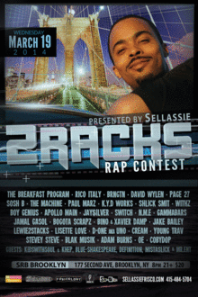 2Racks Rap Contest announces the return to Brooklyn on March 19, 2014. 2Racks is a Nation-Wide Original Song Contest started in 2010 by Sellassie and Inhouse Talent in San Francisco, CA. 2Racks Rap Contest stops in more than 12 cities from coast to coast including Los Angeles, New York, San Francisco, Berkeley, Chicago, DC, Atlanta, Austin, Houston, Orlando & Seattle. 2Racks looks forward to returning to the birthplace of Hip Hop.