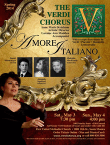 The Verdi Chorus takes great pride in the announcement of its 31st season and the pair of upcoming spring concerts on Saturday, May 3rd and Sunday, May 4th. "AMORE ITALIANO" under the guidance of our Artistic Director, Anne Marie Ketchum, we are anticipating will build upon last years performances, which were our most celebrated to date.