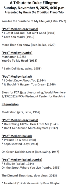 UP TO DATE VACCINATIONS RECOMMENDED, MASKS STRONGLY ENCOURAGED IN MAIN HALL! The IN THE TRADITION Piano Trio PRESENTS: (Bill Jackman - Piano, Michael Jones - Bass, Albert Brooks, M.D. - Drums). ** IN THE INTIMATE PCA CLASSIC JAZZ CLUB ** (complimentary refreshments included) Tribute to "Duke" Ellington November 9, 2025, 4:30 PM