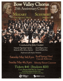 Bow Valley Chorus is celebrating its 25th Anniversary! Come join the celebration as Bow Valley Chorus presents Mozarts Choral Masterpiece Great Mass in C Minor. This joyful work features Mozart at the height of his genius, with beautiful solos and mesmerizing choral movements for both single and double chorus. Also featured is Schuberts elegant and most popular Choral work Mass in G. Bow Valley Chorus, under the inspirational and award-winning musical direction of John Goulart, will be accompanied by a 30 piece orchestra and will feature soloists Hannah Pagenkopf, Krista de Silva, Jason Ragan and Jason Erhardt. Dont miss this special concert event!