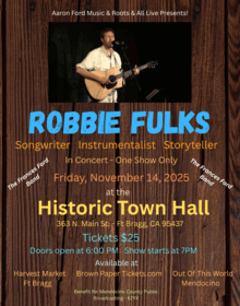 Robbie Fulks is a Grammy nominated, chart topping musician, performing for the first time in Mendocino County. His Hollywood Bowl debut included Steve Martin and Alison Brown, both premier musicians, and both Grammy winners. He has shared the stage and collaborated with other stellar artists including Sam Bush, Jerry Douglas, Linda Gail Lewis, Alison Brown, Lucinda Williams, Sierra Hull, Ronnie McCoury, Tim OBrien, John Cowan, Stuart Duncan. Missy Raines,  Martin Short and Tina Fey. Robbie used to teach at the Old Town School of Folk Music in Chicago, and Tina Fey, who was then a member of the Second City comedy troupe, enrolled as  one of this students in his Saturday-morning Guitar 1 for beginners.