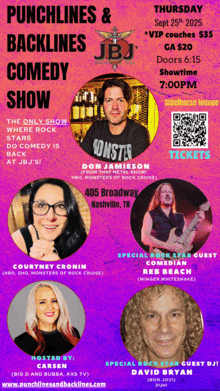 Punchlines & Backlines is a LIVE 90 minute stand-up comedy show that features one, or more, rockstars doing comedy for the first time. Since 2019 we have been featured at multiple rock expos, festivals, Kiss Cancer Goodbye, The Rock N Pod Expo, The Mountain Music Festival, Creatures Fest, KeyWest Comedy Club, and is coming up into it's 5th year on the Monsters of Rock Cruise. The show is produced and written by Courtney Cronin and Don Jamieson and hosted by Izzy Presley. Every show is also headlined by a professional well known comic, or two. Sometimes our shows finish with an acoustic performance by our guest comic and friends.