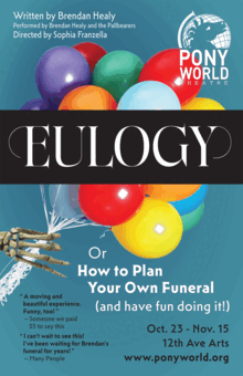 Thank you for attending Eulogy, presented by Pony World Theatre. If you enjoyed the show, please help us spread the word! Every night ends with a difference surprise at the end, and each show has variations with audience interactions and other elements. If you're curious to see these differences, come back and see it again! Follow us on social media and check our website for future projects. Thank you again for coming to Eulogy, or How To Plan Your Own Funeral (and have fun doing it!)