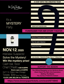 HER STORY THEATER is a non-profit 501(c)(3). It's mission is to shine bright lights in dark places on women and children in need of social justice and community support. Since 2011 our work has highlighted and focused on Chicago Homeless Women, eight years on Domestic Sex Trafficking of Youth; Racism and Missing Women in America. Our HST Chicago Writers Exchange explores writers' works in any genre. We also provide original work on Women's History. Mary Bonnett, Founder and Producing Artistic Director