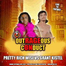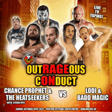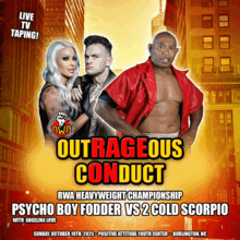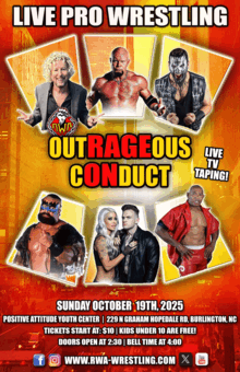 RWA: Outrageous Conduct!  RWA returns to Burlington, NC for a Huge Live Event featuring all of your favorite RWA Superstars such as 6 Time TNA Knockouts World Champion Angelina Love, NWA Star Psycho Boy Fodder, the debut of WCW/WWE Legend 2 Cold Scorpio, Survivor Reality TV Show Legend, Jonny Fairplay, The Dark Child Chance Prophet, WCW Legend Lodi, The Heatseekers and much, much more!!!!!