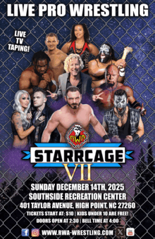 RWA: Starrcage VII - The biggest event of the year returns to High Point, NC on Sunday, December 14th and we are bringing back all the pain and chaos that happens Inside the Steel Cage!!! Featuring the debut of WWE and TNA Superstar and 5 Time World Heavyweight Champion Austin Aries, NWA Star Psycho Boy Fodder, WCW Legend Lodi, "Survivor" reality TV Show Legend Jonny Fairplay, 6 Time TNA Knockouts World Champion Angelina Love, the Dark Child Chance Prophet, and much, much more!!!!! Tickets start at just $10 and kids 10 and under get in free!!! Southside Recreation Center, 401 Taylor Avenue, High Point, NC!!!!!