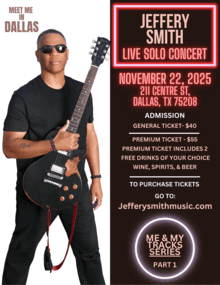 Get ready for an extraordinary night with Billboards renowned #1 Smooth Jazz Guitarist, Jeffery Smith, as he brings his unique and captivating smooth jazz to Dallas, TX.