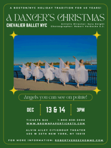 A Dancers Christmas, a 45 year Boston/NY Holiday Tradition, created by choreographer Robert Vereecke S.J., will have its New York performances with the Chevalier Ballet company under the direction of Sara Knight. In addition to Chevalier, there will be guest artists, including Steven Cornwall from Kingston, Jamaica.A cast of children complements the work of these gifted dancers.