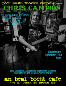 Chris Campion is not a man of the digital age - thank God. While the rest of us peck away at glass screens, oversharing our innards to the void, Chris spins tales the old-fashioned way: out loud, with a guitar in hands and a song on his lips. Acclaimed for his rollicking off-Broadway show "Escape From Bellevue" and the wild memoir that followed, he now returns with a brand-new evening of music, monologues, and meandering Gen X musings. Its part storytelling, part stand-up, part singalong, and wholly unpredictable - the kind of night that makes you forget you even own a phone.