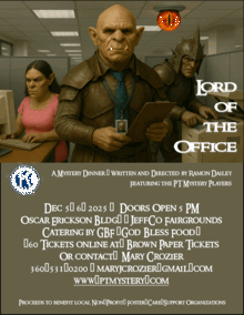 Its never too early to start planning for your company or family Christmas Party or just a fun night out! You can reserve individual tickets or tables of 6 for the annual PT Kiwanis Mystery Dinner. This is a fabulous dinner with an equally entertaining comedy, live-stage, and screen show. Show Times for 2025 will be Fri and Sat nights, Dec 5 & 6, at the JeffCo Fairgrounds - Oscar Erickson Building. Catering by GBF (God Bless Food), Tickets $60. The title this year is: Lord of the Office. Guaranteed to be a blast as you work with your table mates to solve the mystery! This is not your average mystery-dinner in a box. This is true entertainment, just a smidge this side off Broadway!