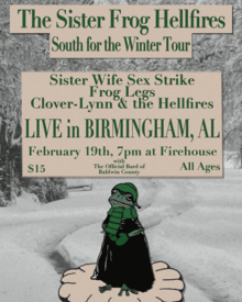 Sister Wife Sex Strike, Frog Legs, Clover-Lynn & The Hellfires, and The Official Bard of Baldwin County at Firehouse Community Arts Center on February 19th 2026. Tickets are $15, Doors at 7pm, Show at 8pm, and it's All Ages!